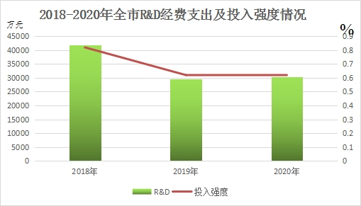 R&D經(jīng)費投入強度(全社會 R&D經(jīng)費支出占GDP的比重,下同)2020年全市為0.62%,2019年全市為0.62%,2018年全市為0.82%(見圖2)。