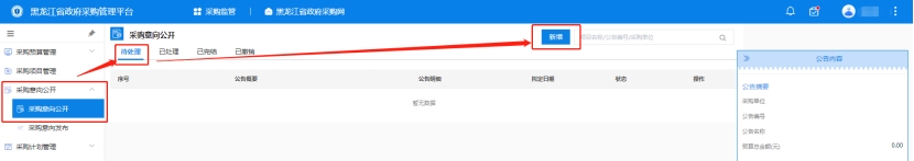 1、采購單位經(jīng)辦人登錄黑龍江省政府采購管理平臺,點擊【采購監(jiān)管】→【采購意向公開】→【采購意向公開】"待處理"中,點擊【新增】按鈕。