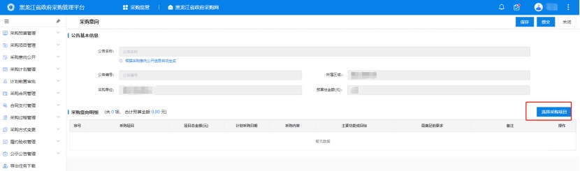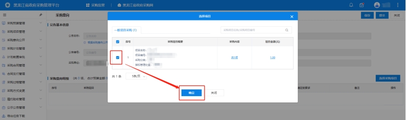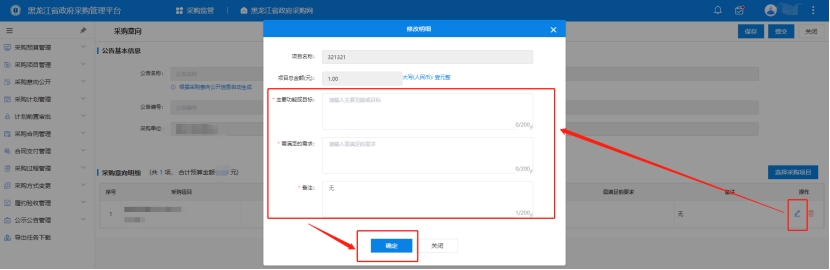 2、點擊選擇采購項目,選擇完成后點擊修改,完善意向公開信息,填寫完成后,點擊保存,系統(tǒng)自動補全公示名稱、公示編號,如圖所示: