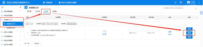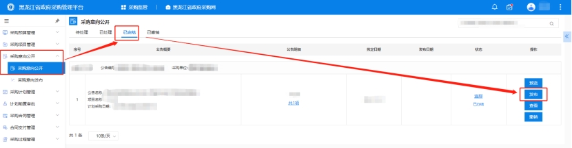 5、單位審核人,審核后,此公示將流轉(zhuǎn)到采購單位經(jīng)辦人,采購單位經(jīng)辦人可點擊【采購監(jiān)管】→【采購意向公開】→【采購意向公開】"已辦結(jié)"中點擊發(fā)布,延遲幾分鐘,此意向即可展示到黑龍江省政府采購網(wǎng)的門戶首頁。