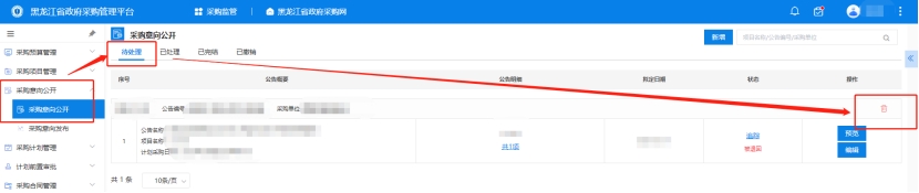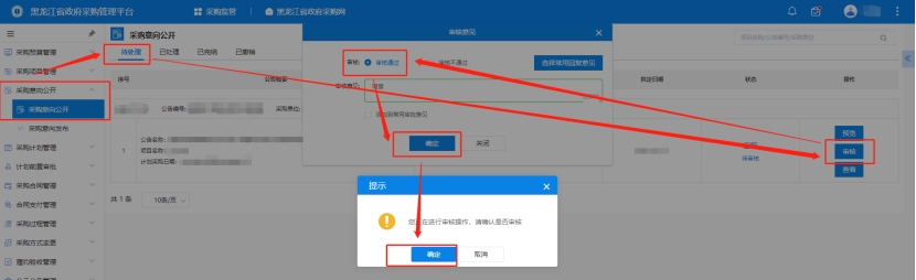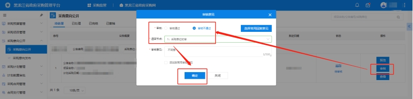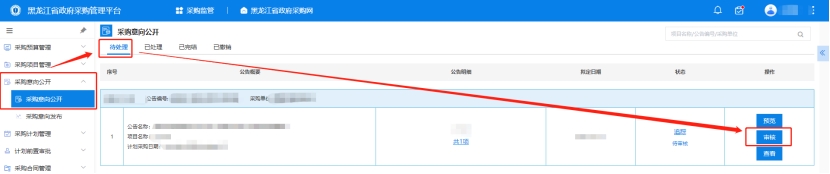 4、采購單位審核人登錄黑龍江省政府采購管理平臺,點擊【采購監(jiān)管】→【采購意向公開】→【采購意向公開】"待處理"下,可點擊【預(yù)覽/審核/查看】按鈕。點擊【審核】按鈕后,可選擇是否通過此意向公開。