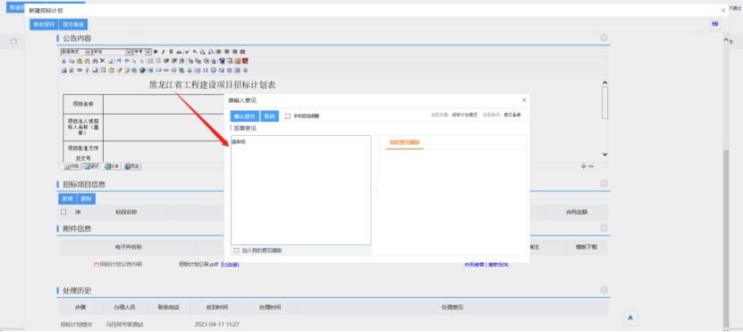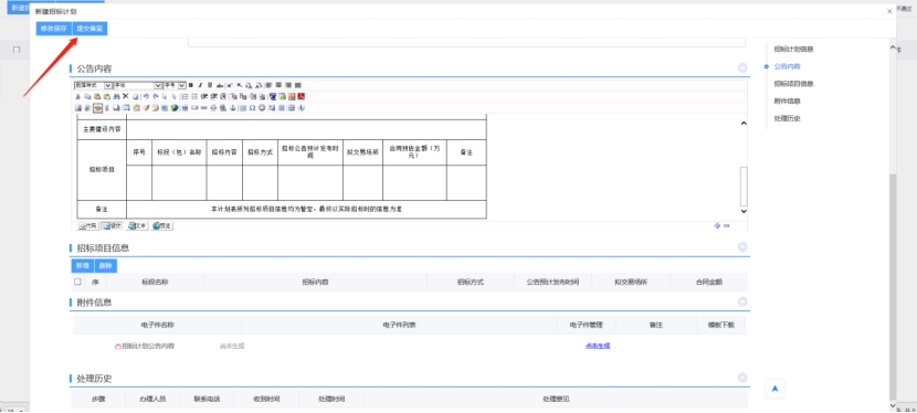 4、填寫完信息,點擊“提交備案”按鈕,彈出意見框,輸入意見后,點擊“確認提交”按鈕,招標計劃完成。(如果點“修改保存”按鈕,則暫時不提交,該信息為編輯狀態(tài),可以修改并提交審核。)如下圖: