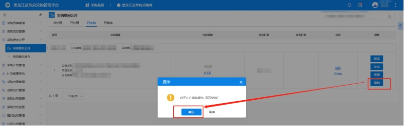 單位經(jīng)辦人賬號可在【采購監(jiān)管】→【采購意向公開】→【采購意向公開】"已完結(jié)"中進行撤銷操作。