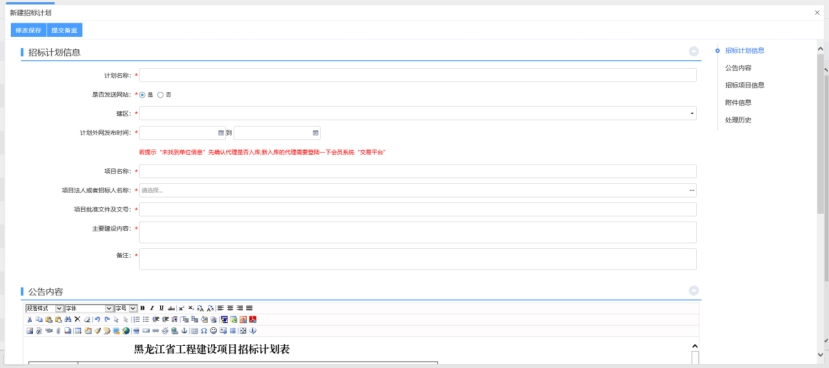 2、點擊“新建招標計劃”,填寫頁面相關(guān)信息(帶*號為必填項),如下圖: