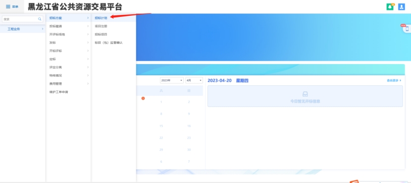 1、招標代理登錄黑龍江省公共資源交易平臺后。首頁拖動鼠標至“菜單”按鈕,選擇“工程業(yè)務(wù)—招標方案—招標計劃”,進入招標計劃頁面。如下圖: