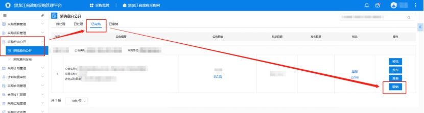 單位經(jīng)辦崗可在【采購監(jiān)管】→【采購意向公開】→【采購意向公開】"已完結(jié)中"點擊撤銷即可將已公示到門戶的采購意向公開撤銷。